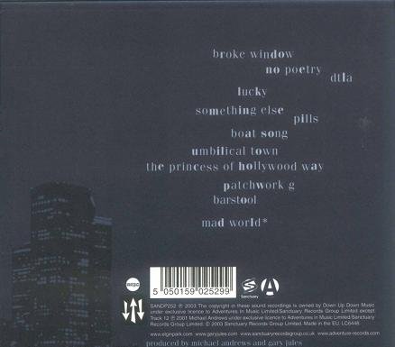 : 01. Brokewindow 02. No Poetry 03. Dtla 04. Lucky 05. Something else 06. Pills 07. Boat Song 08. Umbilical Town 09. The Princess Of Hollywood Way 10. Patchwork G 11. Mad World 本专辑已加入mp3共享计划