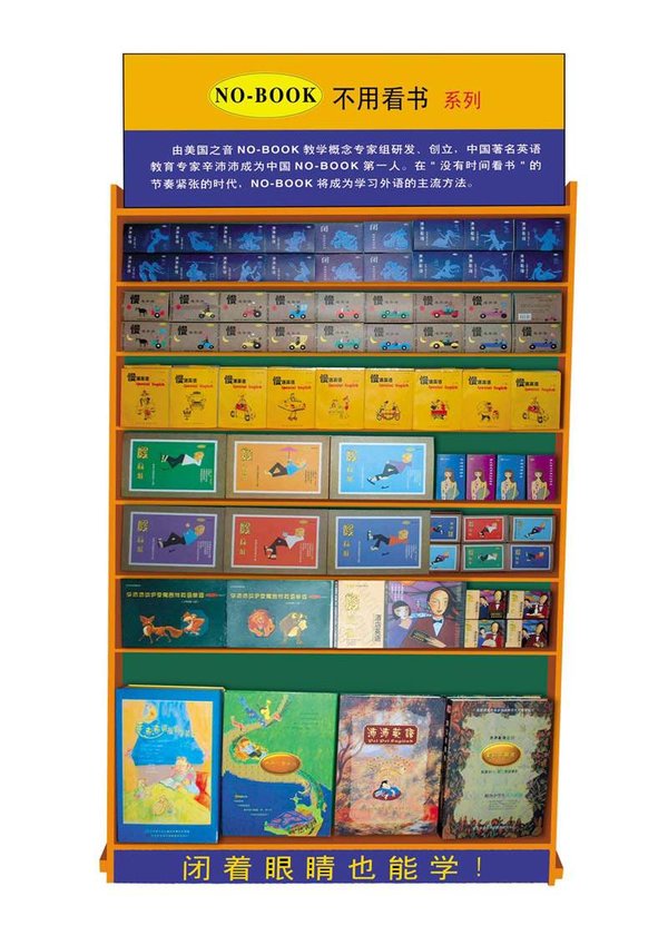 NO-BOOK 不用看书学英语系列音带,CD已在中国各大书店出现热销。由中国著名英语教育专家辛沛沛发明的《傻瓜机英语》也被贴上NO-BOOK标志,辛沛沛也被媒体称作“中国NO-BOOK第一人”。