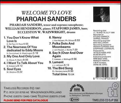 原名Ferrell Sanders的Pharoah Sanders因为宗教信仰改名,他奉行John Coltrane晚期的音乐理念,将爵士乐视为与神沟通的工具,也将自己心底深处的想法、对性灵的探索藉爵士乐传达给听眾。他的音乐总带有神秘的宗教意味,节奏却充满传统非洲的草根力道,在乐曲形式与演奏风格上都是独树一格,对一九六~年代的自由爵士风潮影响深远。在60年代中期自由爵士大兴其道时Pharoah Sanders还刚刚是一名新星。他的成功得益于加入John Coltrane的乐队作为学生辈的乐手,Pharoah Sanders对John Coltrane的影响也是不可忽视的。他们之间最成功的合作要数1965年的《Live In Seattle》了。John Coltrane 撒手而去后,Sanders 又与Coltrane的遗孀Alice合作,那些作品充满的Coltrane晚期的神秘与宗教色彩。