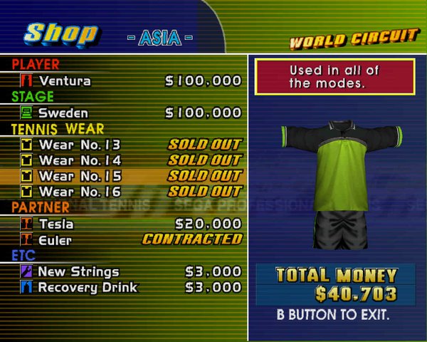 在World Circuit模式里,共有八个训练场地,分别是:Return Ace、Big Wall、Bull's Eye、Cannon Ball、Smash Box、Drum Shooter、Pin Crasher、Giant Ball。以特定的条件完成它们,就可以得到八套隐藏的球衣。