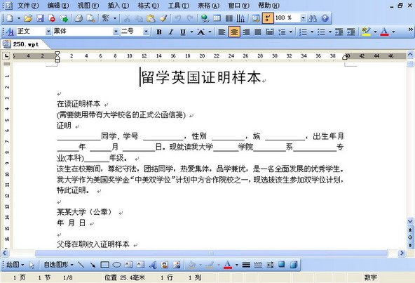 对模板格式做一个说明,由于是WPS2005的格式,所以解压后模板都是.wpt格式。所以WPS肯定是没问题能够读取。我研究了一下,这个是遵循rtf样例。所以经过测试,word2000、word xp、写字板(注意看清,不是记事本)都可以打开这些模板。如果显示是无关联文件,请用拖拽方式或者从word打开命令打开