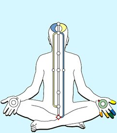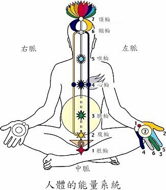 三条经脉、七个能量中心( Chakras七轮 )及灵量 (从梵文Kundalini昆达里尼)