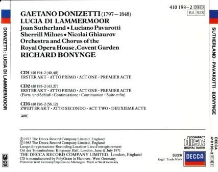 VeryCD上已经有了Callas的两个版本露契亚,这个版本是Sutherland在Decca第二次灌录该剧,但是大多好评都留给了第一次六十年代灌录的版本。首先这个版本硬生生地将两张CD的内容分割成三张CD;其次Bonynge的指挥是一大败笔;第三,Sutherland在此版中的表现明显不如上一版,凸现了戏剧张力但没了感情。可是该版的声效音场一流,不愧于Decca一贯的录制水准。另外帕肥在此版中的表现也是可圈可点,值得一听!