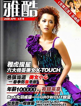 应很多朋友的要求把4月号发布上来。 本期为《雅酷周刊》4月号 酷评 一个馒头味的西饼(酷评馒头事件) 杂拌 雅虎搜星 六大帅哥美女零距离接触(独家接触,独家专访) 恶搞 色狼当道 美女小心-春季防狼手册(搞笑视频,笑到翻) 玄想 年薪十万 有胆来拿(模拟面试,妙趣横生,道尽面试当中的各类问题) 他她 如泡面一般做爱(真实性爱日记+专家点评,帮你计划性爱组合,获得完美性爱体验) 彼岸(上)(中篇小说,凄美迷离) 声色 《达芬奇密码》(达芬奇密码全剖析) BOA 化羽成蝶-《蜕变》(BOA专辑介绍及试听) 杂色 亲手制造香水美人(香水种种,哪款适合她) 连线 吉祥三宝总动员 (吉祥三宝各类恶搞版本大荟萃)