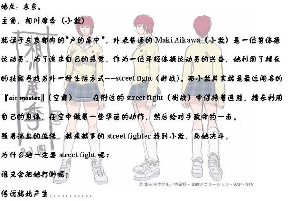 相川摩季(小牧):身高184cm B88_W60_H87 16岁 本片的主角,人称【air master】(空霸)。还是高中生的小牧,凭着自己高超的空中战斗技巧,成为了远近闻名的【女高中生街战士】。小牧的父亲是格斗家,母亲是原体操运动员,本人曾经被称为【日本体操女王】。然而,作为体操选手,184cm的身高还是过于高了,并且作为教练的母亲又突然离开人世,小牧最终还是引退了。自然这件事也就成了她心底无法愈合的伤疤。引退后为了寻找比赛时的那种紧张感和快感,渐渐的成为了街战士。运动员时期的训练+父母的遗传,造就了时常秒杀对手的【air master】。性格:内向,属于思想比较简单的女孩,因此没交过什么朋友。一次意外,结识了同一所高中的几个女生。从而非常诊视这份友谊,也非常感激她们。