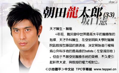 朝田龙太郎(坂口宪二):四年前曾跟随北日本大学参加MSAP,曾带领MSAP最好的医疗队伍TEAM MEDICAL DRAGON「医龙」。因为某件事的关係被开除,变得自暴自弃,放弃了当医生隐居,直至遇上加藤晶...