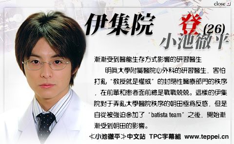伊集院登(小池彻平):实习医生,因为还没被日本医疗制度污染而被朝田看上,并当上了BATISTA的队员,就这样开始了地狱般的人生?一方面讨厌朝田的性格,一方面崇拜朝田的技艺。