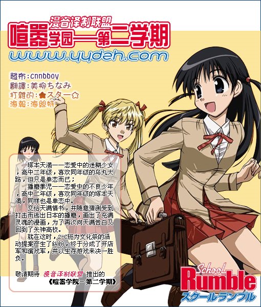 【内容】 http://www.yydzh.com/attachment/Day_060405/29_29_d902e450f050426.jpg 新学期,2-C班为了文化祭的活动提案产生了纠纷,终于分成了开店军和演戏军,并以生存游戏决一胜负 http://images-jp.amazon.com/images/P/B000EPFS8K.01.LZZZZZZZ.jpg 歌:時東ぁみ(www.tokitoami.com) 【LIST】 ⒈せんちめんたる じぇねれ~しょん ⒉この涙があるから次の一歩となる ⒊せんちめんたる じぇねれ~しょん(karaoke) ⒋この涙があるから次の一歩となる(karaoke) 【STAFF】 原作:小林尽 监督:金崎貴臣 系列构成:ときたひろこ 登场人物设计:渡辺はじめ 脚本:ときたひろこ、金春智子、丸尾みほ、高橋ナツコ、江夏由結 美术监督:北原美佐 色彩设计:津守裕子 摄影监督:鎌田克明 音乐:大森俊之 音响监督:たなかかずや 音响制作:ダックスプロダクション 动画制作:スタジオコメット 【CAST】 塚本八雲:能登麻美子 塚本天満:小清水亜美 烏丸大路:小西大樹 播磨拳児:高橋広樹 沢近愛理:堀江由衣 周防美琴:生天目仁美 高野 晶:清水香里 一条かれん:MAKO サラ·アディエマス:福井裕佳梨 …… 【CHARACTER】 http://www.school-rumble.net/character/images/chara_03.gif http://www.school-rumble.net/character/images/chara_01.gif http://www.school-rumble.net/character/images/chara_02.gif http://www.school-rumble.net/character/images/chara_04.gif …… 【OFF WEB】 www.school-rumble.net