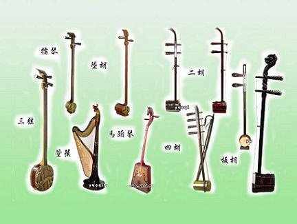 民族乐器:横笛 排箫 笙 唢呐 箎 奚琴 胡琴 半月琴 葫芦琴 琵琶 阮 月琴 古琴 古筝 箜篌