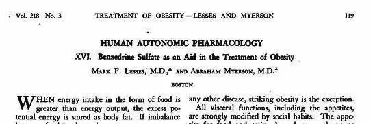 1938年美国医生Lesses和Myerson在新英格兰医学杂志发表论文,报道了在健康人群中,安非他明可以有效抑制食欲、降低体重。