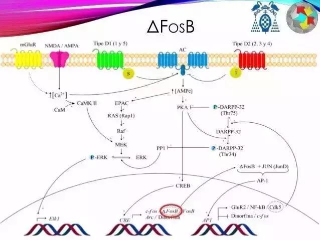 蛋白质DeltaFosB,简称ΔFosB。神经元长期暴露于高剂量的多巴胺,则会通过一系列复杂的信号转导促使细胞核合成转录因子 ΔFosB。