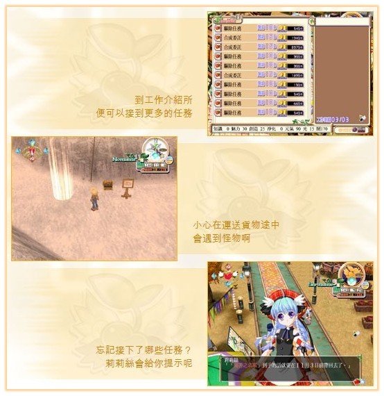※任务※ 在百里城裏,随时会有不同的居民需要帮助。 那就是「千业」十夜大派用场的时候了。 十夜可以因应自己的实力,选择不同种类的任务。 成功完成居民的委託后,得到的金钱报酬将会成为十夜的主要收入来源,另外也有机会得到贵重物品和物品的合成式。 四季屋能否全国知名的商舖,就要看看十夜能够完成多少任务了。