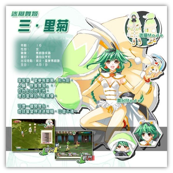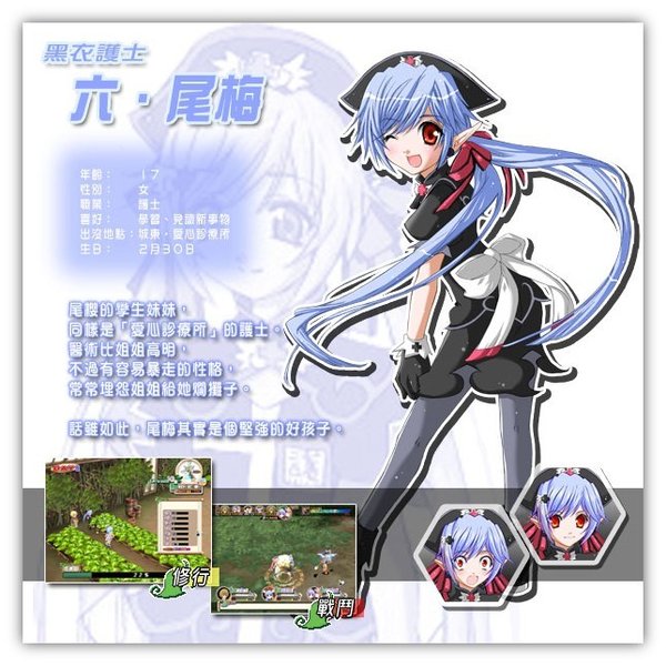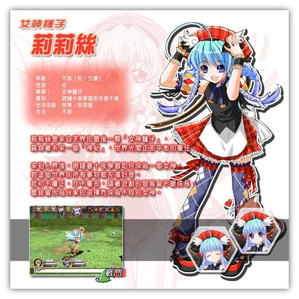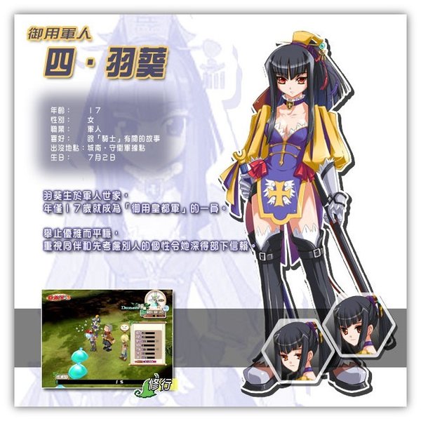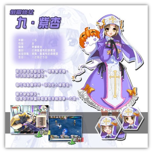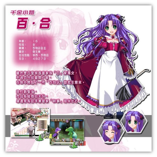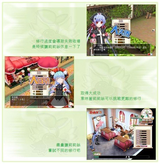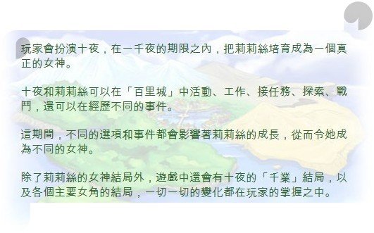 ※修行※ 要将莉莉丝培育成为出色的女神,其中一种最直接的方法,就是千业修行。只要跟城裏的辅助角色谈话,便可以为莉莉丝选择不同的修行。 一开始时,可供选择的修行数目不多,但随著熟练度的增加,莉莉丝便可以尝试挑战更高难度的修行,总数高达27个。每一项工作都会对莉莉丝各项属性有不同影响,需要的费用亦有平有贵。若果胡乱修行,除了令莉莉丝的成长出现问题,十夜也会变得入不敷支。所以一定要小心选择修行的项目哦。