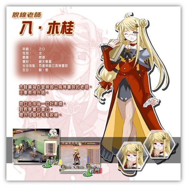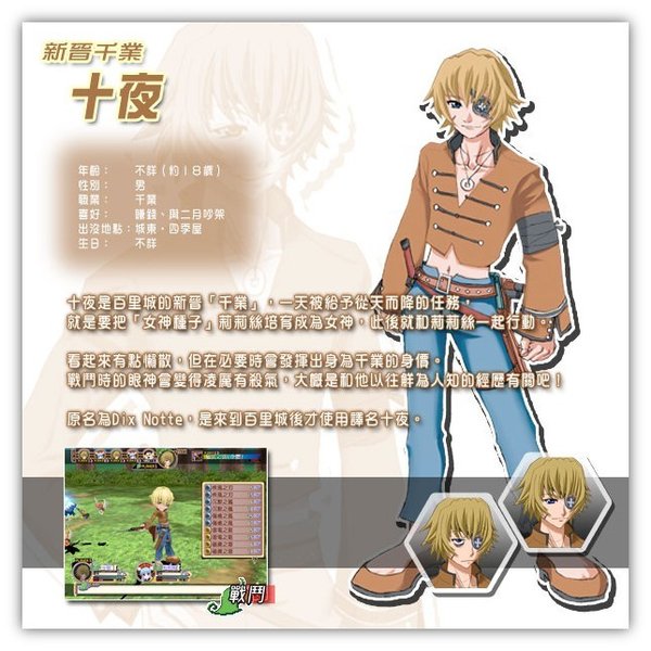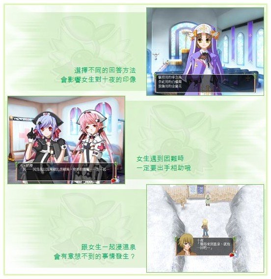 ※恋爱※ 十夜身为千业,自然要跟百里城的居民保持良好关係。 在城中住著六位可爱的女生,都是十夜的朋友。 她们分佈在城裏的不同地域,包括课室、教堂、医院、马戏团和商店等。 十夜可以随时找她们交谈聊天,运气好的话,更会收到女生送的小礼物。 当十夜碰见女生们遇到难以解决的问题时,便要发挥千业的实力,排忧解难。 随著故事发展,十夜有机会得到女生的认同,一起谱出浪漫感人的恋爱故事。