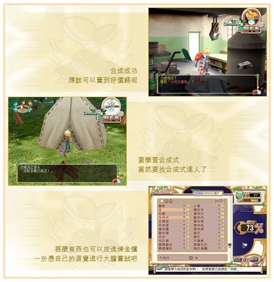 ※合成※ 在四季屋裏有一个「炼金炉」,把不同的物品放进去,便会自动进行合成。 十夜可以把食物合成为高级食材,把普通道具变成高级回复药,一切任凭发挥。 若果合成了珍贵的道具,可以卖得好价钱,也可以交给城裏的指定人物以完成任务。 在城裏和郊外的不同地方,十夜可找到不同的合成式。有了这些合成式,除了可以知道合成所需的物料外,成功的机会率会大大增加。 游戏中共有过千条合成式,努力地把它们全部收集回来吧。