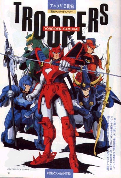 数千年前,由人类内心的软弱和阴暗产生了一种叫妖邪界的东西,人类不断的自相残杀和武力斗争及对强大力量的追求巩固着这个异世界,终于在1000多年前,妖邪界诞生了一具有着邪恶意志的盔甲,盔甲的名字叫阿罗醐。阿罗醐率领妖邪界的恶魔向人类世界发动进攻,而人类却无法抵抗那种强有力的攻势。这时一位叫迦雄须的云游僧拯救了当时的人类,并击败了阿罗醐。阿罗醐留下了自己的铠甲,逃回了妖邪世界。而迦雄须为了防止阿罗醐再次侵犯人类世界,将它留下的铠甲打造成9件有着神奇力量的盔甲,并以人类的9种美德“仁”、“义”、“礼”、“智”、“信”、“忠”、“孝”、“悌”、“忍”封印了它们,然后开始寻找能穿上这些盔甲并守护人类的战士。 然而9件铠甲上带着阿罗醐的妖气,其中4件先后落入阿罗醐手中,4名追求力量而屈服于阿罗醐的人类得到了这4件盔甲,成为阿罗醐的帮凶。阿罗醐经过1000年积蓄力量之后,在20世纪80年代再次向人类世界发动进攻。 这就是《铠传》的起因。 《铠传》,原作矢立肇,TV系列39话,监督池田成(后半部为浜津守),从1988年开始播放,1989年完结,主要讲述的是5位身穿神奇盔甲的少年同妖邪魔王阿罗醐和它手下4大魔将战斗的故事。TV结束后,SUNRISE于1989制作它的第一部OVA《外传》,次年第二部OVA《辉煌帝传说》发售。整个系列于1991年最后一部OVA《信息》悲伤的结局而告终。三部高质量的OVA,尤其是后2部作品,将整个系列的内涵上升了不止一个档次。《铠传》作为一个系列,由TV引出盔甲这个引子,交代了人类与妖魔之间的战斗的起因,然后由OVA完成叙述盔甲的本质和其真正的存在意义,以及拥有盔甲的少年们最后如何去改变自己的命运。因此只看TV系列,那只能留下《铠传》仅仅是热血格斗作品的表象而已,但矢立肇本人是不会只做个二流故事的大师,因此全篇关键就是这3部OVA了。以下分别加以介绍。 作为全系列的开山始祖,国内动漫迷们了解最多的应该是TV系列,也就是被国内翻译成《魔神坛斗士》的《铠传——武士军团》,原本的名字是这么写的《鎧伝サムライトルーパー》,英文名是“YoroiDen-Samurai Troopers”,当然在TV的很多台词里,也是能听出“SAMURAI TROOPERS”这句台词的。日二区于2003年发售了TV系列的限定版DVDBOX。