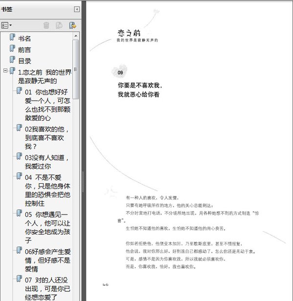 : 1. 恋之前:我的世界是寂静无声的 我想他是爱你的,至少是喜欢你的,至少他的身体里有一部分是喜欢你的。他身体里愿意接受你的那部分是爱,不愿意接受你的那部分是恐惧。当他身体里的爱很多的时候,他会接受你,你们在一起;当他身体里的恐惧很多的时候,他会拒绝你,你根本不会走进他的世界;但是当爱与恐惧持衡的时候,问题就纠结了。 01 你也想好好爱一个人,可怎么也找不到那颗敢爱的心 02 我喜欢的他,到底喜不喜欢我? 03 没有人知道,我爱过你 04 不是不爱你,只是他身体里的恐惧会把他控制住 05 你想遇见一个人,他可以让你安全地成为孩子 06 好感会产生爱情,但好感不是爱情 07 对的人还没出现,可是你已经想恋爱了 08 你很好,只是我们不适合 09 你要是不喜欢我,我就恶心给你看 10 你以为的“好”未必是她想要的“好” 11 有没有一种喜欢,不带任何目的 12 完美主义:找个对象像选妃 13 你是想有个伴,还是觉得应该有个伴? 14 你想要喜欢的人,始终没有出现 15 相互索取,然后假装相爱 16 你只是想要征服他,并非真的喜欢 17 习得性无助:谁会看上我啊? 18 你是想要恋爱了,还是寂寞了? 19 当你本末倒置的时候,你已经忽略了感情本身 2. 爱之时:我们放下尊严放下个性,都只是因为放不下一个人 爱意味着:当他希望独处有暂时的个人生活空间时,我不强迫他陪我抽时间关注到我,我自己也能自得其乐,照顾好自己,生活过得愉快充实;当他需要我陪在他身旁,一起分享心情与感觉时,我能排除所有杂念,全心全意将心灵交给他。 01 他对我没那么好了,他是不是不爱我了? 02 如果你爱我,怎么舍得我难过? 03 他做到了优秀,却没有做到自己 04 没有人可以给你生命的归属感,即使是最爱的恋人 05 你所有的努力,不过是希望他多爱你一点 06 爱着爱着就不爱了,恋着恋着就散了 07 你总是有事没事想起他的 EX,然后万分委屈 08 你所有的情绪,都是为了逼他表达爱 09 不是宠爱就可以 10 他爱你,不是因为你好才爱你 11 或许,你只是想让他关注你 12 我不想世界有任何一点伤害发生 13 当激情退去,是习惯还是爱 14 我这么努力地爱你,你怎么就不能努力地爱我? 15 性可以导向爱, 但性不是爱/ 16 感情里的外遇:第三者与精神出轨 17 因为我爱你,所以我需要你 18 爱的人明明在身边,却还是感到无比孤独 19 你生气的时候,总是喜欢冷战 20 权力争夺期:控制对方 21 被压抑的危机元素 22 不是所有的真相都好听 23 你只是不知道该如何表达爱 3. 分之后:那些曾经以为的花好月圆 你遇上一个人,你爱他多一点,那么,你始终会失去他。然后,你遇上另一个,他爱你多一点,那么,你早晚会离开他。直到有一天,你遇到一个人,你们彼此相爱。 01 放弃是痛苦的,因为还有爱 02 爱情,不是“对你好”就可以 03 失恋是一件终究会过去的事 04 你觉得自己是世界上最不幸的人,你被欺骗得一无所有 05 爱不是要强行拿走他的东西,而是增加自己的重量 06 拒绝改变:对安全的需求大于爱情 07 你遇到的照顾你身体的人,远远多于照顾你灵魂的人 08 自我服务偏见:只看到自己的付出,看不见对方的 09 你对她有一个期待,期待她原谅 10 你不惜错失了那么多,只是为了证明你是对的他是错的 11 你所能持久爱的人,必然是你们能彼此付出相当的人 12 为什么失恋会使你感觉如此失落 13 他曾经能给你的,别人也能给 14 你不过是,失去了一个原本就不属于你的人 后记 发神经不是问题,问题是发完神经还想发