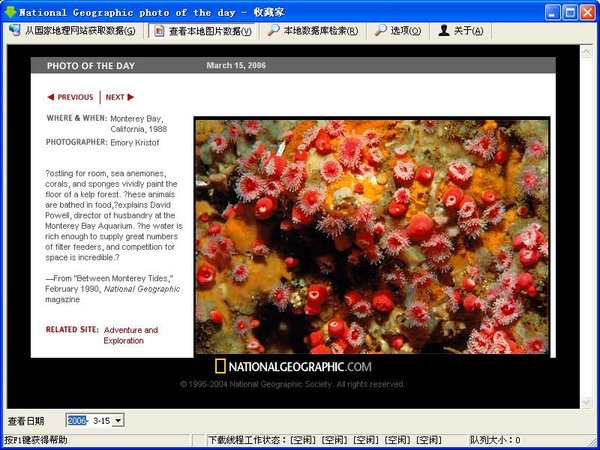 1、本资料内容:收集了美国国家地理杂志“每日一图”栏目的2001.03.13至2006.03.15的所有图片,共1780张(数据库显示1791张,因官方有11张重复),每张图片包括1024*768、800*600两种分辨率各1份。每张图片均附有拍摄时间、地点、作者、简介,而且带有数据库全文检索,而且可以随时上网更新数据库、自动下载新图片。我做的唯一工作不过是通过软件自动下载了所有照片,对自动下载不成功的进行了手工下载,然后修改了一点点使用说明而已。对于2006.03.15以后的图片,请大家通过本软件自动更新、下载,非常方便的,呵呵。