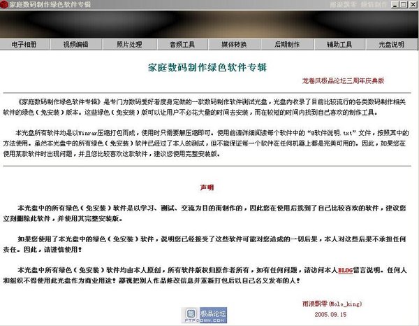 本光盘收录了电子相册制作、视频编辑工具、数码照片处理工具、音频工具等七大类工具软件,都是我在数码制作过程中挑选保留下来的。为了方便自己使用,我把它们做成绿色版,这次刚好分享出来做为本坛建坛三周年的庆典献礼。(有两、三个小工具不是我的原创,因为原软件就是绿色的,我做了说明,希望大家不要误解)