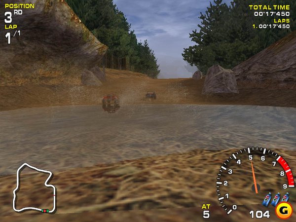 另一方面,在《乡巴佬越野赛车》的冠军锦标赛模式中也集中了大部分游戏的缺陷。这些缺陷中最值得注意的是你在领先位置的时候电脑对手的作弊。实际上,一开始你的赛车已经处于比其他赛车差的情况下了,而更严重问题的是电脑为了超越你,总会有莫名其妙的运气帮助它,而且几乎都是利用你的尾流来重新获得领先的位置。有时候,电脑也会犯一些错误--但这种情况是很少很少的,即使遇到意外,电脑恢复正常情况所需的时间也很短。电脑作弊的情况非常的明显,它对每条赛道的情况都掌握的非常充分,尽可能得寻找捷径,甚至你同其他赛车或赛道边的物体发生轻微的冲撞的结果也使你远远落在队伍后面。 在冠军锦标赛模式中想要进行完美的驾驶绝对需要掌握前面赛车和赛道的情况,但是由于游戏中不一致的碰撞监测使得这些很难完成。一些赛道中的有着墙壁上突出的小物体或者障碍物,特别是在急转弯的地方,但是你明明可以安全的利用空间避开这些物体,可你的赛车仍旧会和它们发生莫名其妙的碰撞,往往到手的胜利就化为泡影。通过刹车可能可以安全的避开这些物体,但你一般不会这么做,因为看上去前面有足够的空间可以在高速下做这样的转弯。至少当你对每条赛道都相当熟悉以后,碰撞物体所造成的坏结果看上去才能减到最小。尽管有这样的缺点,《乡巴佬越野赛车》的赛道设计还是相当的出色,赛道中有着相当丰富的捷径,即使在驾驶了多圈以后仍旧会对赛道保持很高的兴趣。