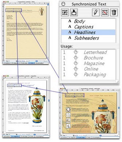 有一项新的文本同步功能可以在不同的版式空间中交叉使用。需要同步的文本被保存一个专门的调色板中,其操作方式与其他调色板非常类似。点击或拖放调色板上的图标就可以在多个文档中插入文字。同步的文字如果发生变动,各个文档中的相应文字部分都会随之变化(只是文字内容变化,但仍会保持原有格式)。这一功能也有一些不足之处。在测验期间我们发现文本同步时只能以文本框为单位进行的,显得不够灵活。而且,同步功能也仅限于文本;不支持图片的同步。当然,它仍然不失为一种强大的工具,可以让你在不同的版面(比如印刷手册和Web页面)中使用同样的文字,这将有助于各个版面的用语保持一致性。