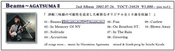 上妻宏光(あがつま ひろみつ),1973年7月27日出生于日本茨城县日立市(罗马音是Hiromitsu Agatsuma,可以到google搜索),6岁起就开始学习演奏三味线。1988年他年仅15岁就赢得了全日本津轻三味线竞技大赛的冠军,是该竞技大会有史以来最年轻的优胜者。1995和1996年连续两年在“津轻三味线全国大赛”上获得冠军,在日本邦乐的范畴里受到很高的评价。然而上妻宏光并未就此满足于日本邦乐(即日本传统民族音乐)的范畴,致力于开拓三味线的音乐新领域,尝试将这件古老的传统乐器与各种不同的音乐元素相结合。