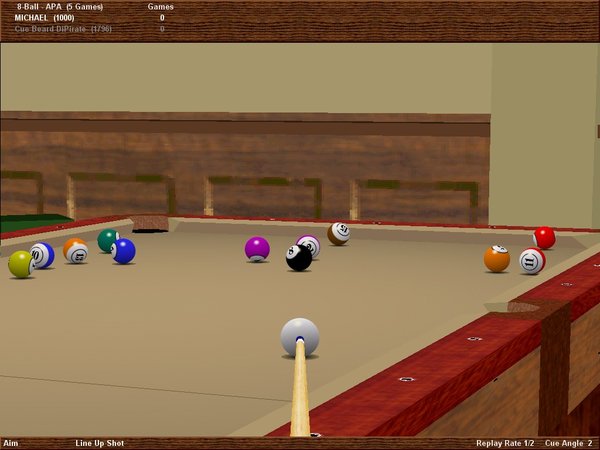 Quit Match-退出比赛,Change Turn-让杆,Kibitz Shot-自我训练模式时,可以让电脑提示你下一杆的打法,显示了电脑提示的路线之后,按空格键即开始按此路线击球,Call Shot-叫球(在Eight Ball系列(UK rules除外)和Straight Pool中,告诉电脑或对手你要击打的球和球袋),Miscall-宣布无效(在Eight Ball系列(UK rules除外)和Straight Pool中,如果入袋的球或者入的袋不是你预料的,可以宣布此球无效,完全靠自觉),Push Out-在9球和10球中,开球之后,可以将母球向任意方向击打,不需要碰到任意球,Called Safety-在Straight Pool中,Called Safety之后,即使球入袋,也会让给对手,Draw Game-平局,Resign Game-放弃比赛,Spot Lowest Ball-重置最低分值的球,Tournament Draw Sheet-锦标赛进度表,Spot/Pocket Balls-纯练习模式选放的球,Designate Ball On-指定球(只适用于斯诺克,打进红球之后,选择彩球的时候用到,等同于按“S”,Nominate Free Ball-指定自由球
