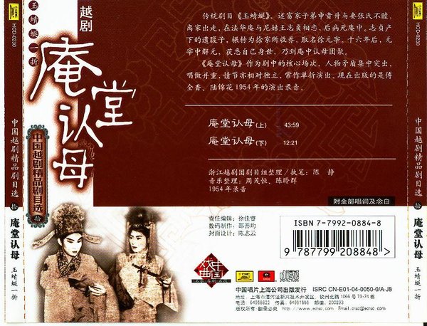 传统剧目《玉蜻蜓》,述富家子弟申贵升与一如妻张氏不睦,离家出走,在法华庵与尼姑王志贞相恋,后病死庵中。志贞产下的遗腹子,辗转为徐家所收养,取名徐元宰。十六年后,元宰中解元,获悉自己身世,乃到庵中认母团聚。《庵堂认母》作为剧中的核心场次,人物矛盾集中突出,唱做并重,情节亦相对独立,常作单折演出。现在出版的是傅全香、陆锦花1954年的演出录音。