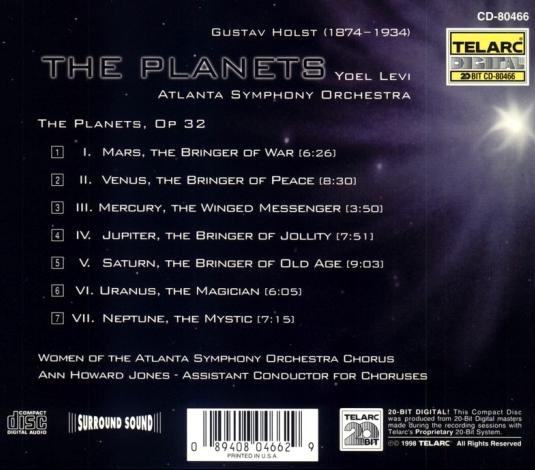 : 01. Mars, the Bringer of War 02. Venus, the Bringer of Peace 03. Mercury, the Winged Messenger 04. Jupiter, the Bringer of Jollity 05. Saturn, the Bringer of Old Age 06. Uranus, the Magician 07. Neptune, the Mystic