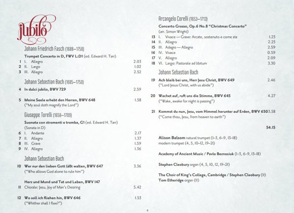 在西方世界,小号的辉煌声音经常被用来点缀节日的喜庆。小号明星Alison Balsom擅长valved trumpet与natural trumpet。她以鲜明形象与从容的virtuosity走红国际,英女王封她OBE啊!本碟属节庆性巴罗克范畴,像圣诞期间西人要上演《胡桃夹子》芭蕾,有些music也与耶诞关係密切;例如柯里尼的《圣诞协奏曲》。录於去年6月至今年6月之间,包括JS Bach,Corelli,Torelli和Fasch的协奏曲与Chorales。Balsom的拍档包括Academy of Ancient Music和剑桥英王学院合唱团。Cleobury更在几乎所有JS Bach选曲中,亲自弹管风琴。唯一没有亲自弹的一曲,是最流行的《Jesu Joy of Man’s Desiring》。原因,可能是此曲人人熟悉,不容有失;合唱的phrasing要尽善尽美。(刘志刚)