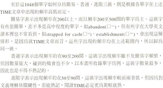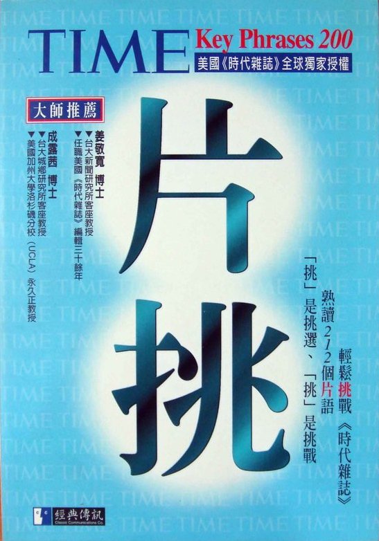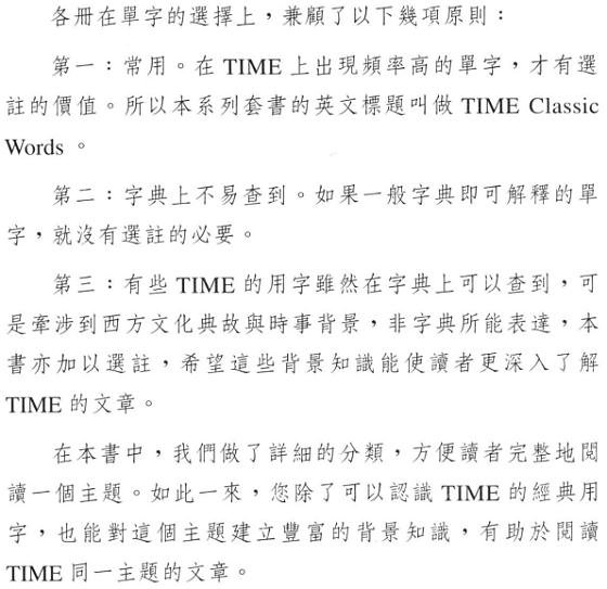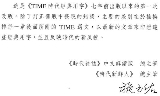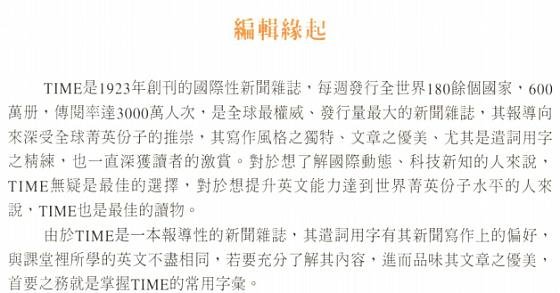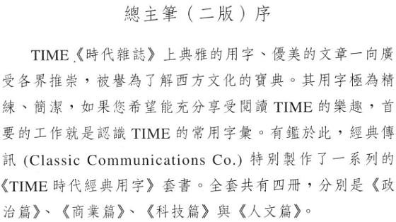 总主笔(二版)序 节选 《TIME时代经典用字 人文篇》是本系列丛书之一。 它的编写方式以增强字汇能力、提供背景知识、辅助阅读TIME《时代杂志》与TIME EXPRESS《时代杂志》中文解读版为目的。 《人文篇》中的字汇分为影剧、文学与语言、媒体、音乐与艺术、哲学、宗教、社会与一般等八类。 这些类别的内容,难免有重迭、不易划分清楚之处,例如文学和影剧这两类便是如此。 而在「一般」类中所收录的,则是一批无法分类的孤儿。 它们在TIME的 各类文章中出现频率极高,却不属于《政治篇》、《商业篇》、《科技篇》,也不属于《人文篇》其它七项类别。 这个部份的字汇不像本书的其它七项类别,无法提供一个完整的背景知识,所以重点放在单字本身的研究上: 包括字源的探讨与类似单字的分辨。 读者不妨把这个部份当作纯粹的英文单字研习。    至于单字的批注方式,除了说明它的由来、构造、演变以及用法之外,也会提供相关的其它单字以便读者参照。 遇有特殊典故,不论是文学的、历史的、时事的,亦有详尽的解释。 最后附上例句,选自TIME的各类文章,以落实 读者了解该字的用法。    在每一类单字结束前,附有一篇精选的TIME选文,让TIME的一流作家来现身说法, 刺激读者对该类主题做更深一层的思考,并且在优美的文章中落实这些单字的用法。 《人文篇》的这八篇选文,在语气、风格、立场等方面各不相同,但是篇篇都有它的价值,值得一读再读。   《人文篇》提供的单字与背景知识,对读者最直接的帮助,在于阅读TIME中列于标题 The Arts之下的 Art,Multimedia,Music,Books,Opera,Cinema,Design,Fashion,Theater, Architecture,Show Business,Dance等等专栏以及 Religion,Viewpoint,Idea,Profile,People等等独立的专栏。 此外,《人文篇》许多字汇亦散见于TIME的新闻报导文章与Essay之中。 所以,只要完整地阅读本书各主题后,读者便能轻易阅读TIME的人文性文章,克服阅读的障碍。 在本书中所收集的用字与评论,都是以此为目标。 当您轻松看完《TIME时代经典用字 人文篇》后, 相信您将具有足够的阅读能力来了解 TIME中大部份的文字,充份享受阅读TIME的乐趣,自己来领略这份西方文化的宝典。 而如果能征服TIME的文章,那么现代英文当中,除了专业技术性 文字以外,大概没有什么文字可以难倒读者了。 《时代杂志》中文解读版 总主笔 《时代新鲜人》 总主笔 施元祐