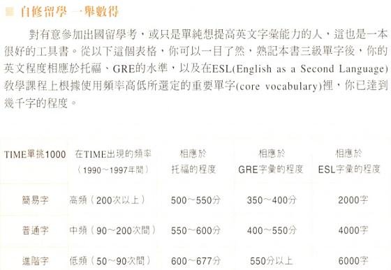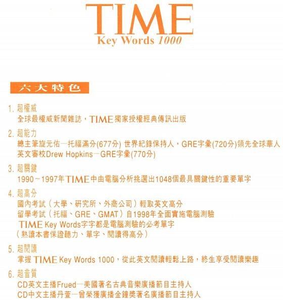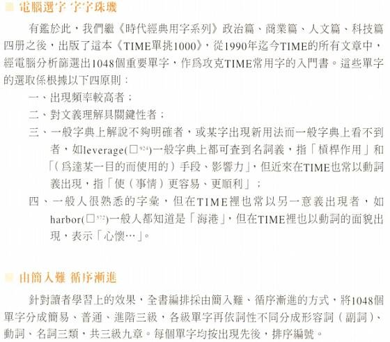 这是第一次在台湾购书(网购),开始想在金石堂和博客来网购《刘毅突破英文词汇》系列,主要是看中附书的CD。 大陆版录音朗读的质量,诸位学友并非不知。 自己学习英语,感觉实在欠刘毅那4本书太多; 无奈愿望总是受到预算的约束,那套书委实太贵,于是在露天拍卖和奇摩拍卖上寻求替代者。 在VeryCD上久闻《time 单挑1000》的大名,新东方老师也是不遗余力推荐。 一搜,满屏尽是施元祐。 由于经典传讯公司已经倒闭,旋元佑很多经典之作已成绝响(想不通吧),《TIME单挑1000》最高已经炒到原价的三倍以上! 想想VeryCD上已经有该书影印PDF和磁带转录音频,为了边际收益最大,忍痛割爱,转而瞄向《TIME时代经典用字》系列。