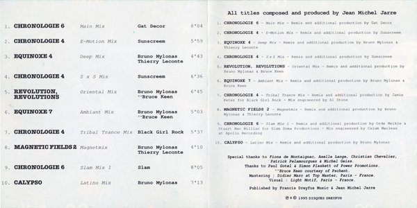 : 01. Chronologie, Pt. 6 [Main Mix] 02. Chronologie, Pt. 4 [E-Motion Mix] 03. Equinoxe, Pt. 4 [Deep Mix] 04. Chronologie, Pt. 4 [Sxs Mix] 05. Revolution, Revolutions [Oriental Mix] 06. Equinoxe, Pt. 7 [Ambiant Mix] 07. Chronologie, Pt. 4 [Tribal Trance Mix] 08. Chants Magnetiques II [Magnetmix] 09. Chronologie, Pt. 6 [Slam Mix 1] 10. Calypso [Latino Mix]