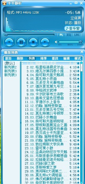 : 01.帕赫贝尔:卡农 02.格里格:“清晨”皮尔金组曲 03.维瓦尔第:四季小提琴协奏曲“春” 04.柴可夫斯基:天鹅湖“情景” 05.莫扎特:小夜曲 06.贝多芬:月光奏鸣曲 07.德沃夏克:第九号交响曲“新世界” 08.华格纳:女武神 09.卡尔欧菲:布兰诗歌 10.盖希文:蓝色狂想曲 11.亨德尔:水上音乐 12.约翰·施特劳斯:蓝色多瑙河 Best Classics 2 01.贝多芬:第五号交响曲“命运” 02.莫扎特:第21号钢琴协奏曲 03.巴赫:小步舞曲 04.柴可夫斯基:胡桃钳“特巴雷克舞曲” 05.穆梭斯基:展览会之画 06.莫扎特:法国号协奏曲 07.西贝流士:卡列里亚组曲 08.约翰·施特劳斯:春之声圆舞曲 09.约翰·施特劳斯:维也纳森林的故事 10.勃拉姆斯:大学庆典 11.雷可莱:小鼓 12.圣桑:动物狂欢节“天鹅” Best Classics 3 01.马斯奈:泰伊思冥想曲 02.拉赫曼尼诺夫:帕格尼尼主题变奏曲 03.巴赫:G弦之歌 04.李斯特:爱之梦 05.萧邦:降E大调第二号夜曲 06.莫扎特:A大调短笛协奏曲 07.佛汉威廉斯:绿袖子幻想曲 08.柴可夫斯基:胡桃钳“糖梅仙之舞” 09.阿尔诺尼:慢板 10.巴赫:耶酥,人们仰望喜悦 11.圣桑:动物狂欢节“水族” 12.瓦德菲尔:溜冰者圆舞曲 Best Classics 4 01.柴可夫斯基:第一号钢琴协奏曲 02.贝多芬:悲怆奏鸣曲 03.麦尔斯:短歌 04.威尔第:曼陀玲协奏曲 05.莫扎特:第25号交响曲 06.柴可夫斯基:睡美人圆舞曲 07.穆梭斯基:基辅城门 08.柯普兰:众人信号曲 09.威廉斯:奥林匹克鼓号曲 10.门德尔松:乘着歌声的翅膀 11.莫扎特:第41号交响曲“朱庇特” 12.西贝流士:芬兰颂 Best Classics 5 01.贝多芬:第六号交响曲“田圆” 02.亨德尔:萨巴女王驾到 03.巴赫:无伴奏小提琴协奏曲 04.柴可夫斯基:如歌行板 05.帕格尼尼:常动曲 06.亨德尔:皇家烟火 07.萧邦:即兴曲 08.柴可夫斯基:弦乐小夜曲 09.艾尔加:爱的礼赞 10德沃夏克:斯拉夫舞曲 11.马斯奈:领袖 12.门德尔松:仲夏夜之梦“夜曲” Best Classics 6 01.莫扎特:第40号交响曲 02.柴可夫斯基:胡桃钳子进行曲 03.苏佩:轻骑兵序曲 04.海顿:降E大调小号协奏曲 05.奥芬巴哈:天堂与地狱 06.比才:阿莱城姑娘“法兰都舞曲” 07.克拉克:小号即兴曲 08.鲍凯利亚:小步舞曲 09.普罗利菲夫:交响组曲“基杰中尉” 10.哈洽图良:盖聂“剑舞” 11.马勒:第一号交响曲“巨人” 12.霍特斯:行星组曲 Best Classics 7 01.巴赫:布兰登堡协奏曲 02.圣桑:第三号交响曲“管风琴” 03.莫扎特:一个音乐玩笑 04.萨蒂:第一号吉姆培迪诺 05.肖邦:第三11号圆舞曲 06.维瓦尔第:四季小提琴协奏曲“秋” 07.德彪西:月光 08.贝多芬:第七号交响曲 09.贝多芬:第八号交响曲 10.门德尔松:春之歌 11.德沃夏克:母亲教我的歌 12.韦伯:邀舞 Best Classics 8 01.巴赫:D小调触技曲与赋格曲 02.拉威尔:波丽路 03.勃拉姆斯:第六号匈牙利舞曲 04.理查史特劳斯:查拉图斯 05.门德尔松:婚礼进行曲 06.莫扎特:土耳其进行曲 07.华尔顿:加冕进行曲 08.约翰·施特劳斯:香槟波加 09.巴赫:古诺圣母颂 10.德彪西:棕发少女 11.艾尔加:“谜”变奏曲 12.威尔第:阿伊达进行曲 Best Classics 9 01.舒伯特:鳟鱼五重奏 02.巴赫:第二号管弦组曲 03.萧邦:E大调练习曲“悲伤” 04.西贝流士:黄泉的天鹅 05.海顿:第94号交响曲“警愕” 06.海顿:第101号交响曲“时钟” 07.罗西尼:弦乐奏鸣曲第四号 08.奥芬巴哈:船歌 09.舒曼:浪漫曲 10.克莱斯勒:爱之悲 11.克莱斯勒:爱之喜 12.舒伯特:圣母颂 Best Classics 10 01.勃拉姆斯:第五号匈牙利舞曲 02.莫扎特:费加罗婚礼 03.科特比:波斯市场 04.艾尔加:威风凛凛进行曲 05.比才:卡门组曲 06.伯恩斯坦:豪勇七蛟龙 07.苏莎:永恒的星条旗 08.萧邦:第三号波兰舞曲“军队” 09.李斯特:匈牙利舞曲 10.约翰·施特劳斯:爆炸波尔卡 11.理林姆斯基可沙可夫:大黄蜂飞行 12.鲍罗汀:鞑靼舞曲