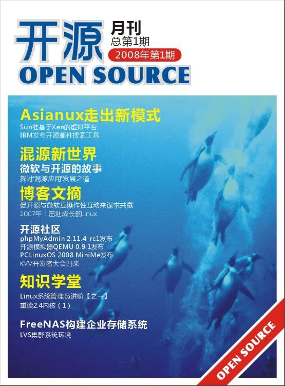 2008年,《开源》创刊了,这个在我们脑中酝酿了五年之久的开源电子杂志终于蹒跚地走到了大家的面前。 我们的奋斗目标。5年,作为一个时间段,能改变很多的东西,曾经听一个人生规划师讲解过,对于人生的理想,应该以5年作为一个时间段划分,逐步实现。《开源》这本电子杂志也迈过了设想之初的5年,完成了一次跳跃。而5年时间的沉淀,也是希望《开源》这本电子杂志一经推出,无论面临多大的困难,也要顽强地存活下去。   5年前,开源在我国刚刚兴起不久,那时对于开源的概念更多的等同于Linux,而Linux更多的作为一些专业人士手中的“玩物”,大家乐此不疲地玩赏着这个新鲜的东西,在小范围进行着交流、讨论、推广。   5年的时间过去了,开源已经深入人心,对于开源,人们的理解不只局限于Linux,而更多优秀的开源项目(MySQL、Apache)也得到了广泛的应用,开源已经构成了一条完整的生态链,完全覆盖了从底层的操作系统、中间件,到上层的应用软件、Office、ERP等范围,从IT环境搭建到IT运维,已经提供了更多的开源选择。   Intel、Sun、IBM、Google、Oracle等厂商不同程度地对开源给予了支持,红帽、红旗等开源厂商不断的发展壮大起来,甚至曾经开源的死对头微软也开始频繁的与开源接触,寻求与开源社区、开源项目的合作机会。在这样的一个时机,我们认为《开源》这本电子杂志是时候该与大家见面了。   我们将《开源》定位在关注开源产业的发展、推动开源项目的进展、促进开源应用水平的提高,受众群体将从开源产业的决策人员向下覆盖到开源应用的初学者。对于办刊思路,我们本着开放的思想,希望接纳来自各方的意见,群策群力,同时承诺该电子杂志永远免费阅读。   《开源》本着实用的原则,目前划分了七个栏目,第一个栏目是产业聚集,其中包括两块内容,第一是资讯,对于发展得如火如荼的开源领域,一月的时间会发生很多很多的事件,而这个栏目将对一月的新闻有个采集汇总,而第二块内容则是对一些热点事件的深度或持续的关注,或者评论,或者报道,使读者能清晰地理清开源领域发展脉络。   第二个栏目是博客文摘,作为Web 2.0的代表作,博客已经越来越深入得影响了我们的生活,博客开放的思想与开源多少有着一脉相承的味道。这个栏目我们将选取一些开源领域重量级人物的博客,做成文摘的形式,使读者在了解开源动态的前提下,更多地了解到一些前沿的观点。   开源社区是开源的灵魂,这样的观点得到了大家的公认。第三个栏目就将完全关注开源社区,其中会有从社区走出的开源项目的一些最新动态的报道,对于一些优秀的开源项目,也将以科普的形式进行详细的介绍。同时,对于我们开源社区的一些活动,开源社区的一些新技术,来自开源社区的议论都将在这个栏目呈现给大家。   知识学堂这个栏目主要普及开源的知识、文化,以及一些大家都关注的开源应用。以讲座和连载的形式让大家都深入的了解开源文化,对于一些长篇的开源应用讲座,也将在这个栏目进行体现,这类讲座将包括基础的命令讲解到高级的内核解读。   桌面应用将介绍来自桌面的新产品、新工具、新应用,以及各式各样的应用技巧。同时会对桌面软件进行评测和试用报告,刚刚迈进开源应用大门的初学者能从这里获得足够的信心,完全地玩转开源的各种应用。  企业级应用则将推出企业级的新产品、新方案,同时对运用开源软件进行IT环境搭建和运维进行指导,介绍能满足于企业级应用的优秀开源项目,对于复杂IT 环境应用中的各种问题也将进行讨论,这个栏目的宗旨一句话可以概括:“自从用了开源企业级软件,我们明显感觉更省钱了。”   混源新视界则是我们推出的一个战略性的栏目,在开源与商业越来越紧密的今天,混源应用得到了广泛的发展。目前的IT环境,很少有纯开源或者纯闭源的软件,开源与传统的商业软件更多的是融合在一起,协同工作。对于混源这个概念,微软也有着自己的解释,那就是异构环境,无论是混源还是异构,毕竟是未来的趋势,趋势性的东西就是值得我们关注的东西,昨天经典的“LAMP”架构到了今天又延伸出了“WAMP”架构,这都是来自混源的魔力,而受益的都是最终用户。   七个栏目组成了我们第一期电子杂志,《开源》这本电子杂志就如同当年那个笨拙的小企鹅,需要更多的人关注和支持,需要更悉心的照料,它才能存活下来,才能健康的成长起来。第一期杂志难免有诸多不尽人意的地方,也希望大家将更多的意见反馈给我们,我们将尽力将这本开源领域惟一的电子杂志办的更好。   目前编辑部正在筹建阶段,希望有兴趣的朋友可以和我们取得联系,我们希望与众多的开源朋友一起,以开源理想为指导思想,为开源社区、开源领域提供一份永久的免费杂志。对于七个栏目的划分,我也进行了简单的介绍,有针对这七个栏目的优秀稿件,希望大家踊跃投稿。   今天,我们出发了,我们不希望收回迈出的步伐,也不希望一步迈进大坑里。一本持续的、关注开源的、永远免费的电子杂志,这是我们的愿景,也是我 开源电子杂志Linux宝库拥有版权 知识中国的好友邀请链接 知识中国电驴乐园个人主页