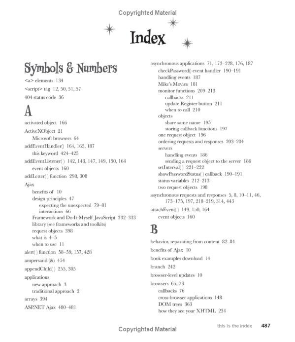 Using the unique and highly effective visual format that has turned Head First titles into runaway bestsellers, this book offers a big picture overview to introduce Ajax, and then explores the use of individual Ajax components -- including the JavaScript event model, DOM, XML, JSON, and more -- as it progresses. You'll find plenty of sample applications that illustrate the concepts, along with exercises, quizzes, and other interactive features to help you retain what you've learned.