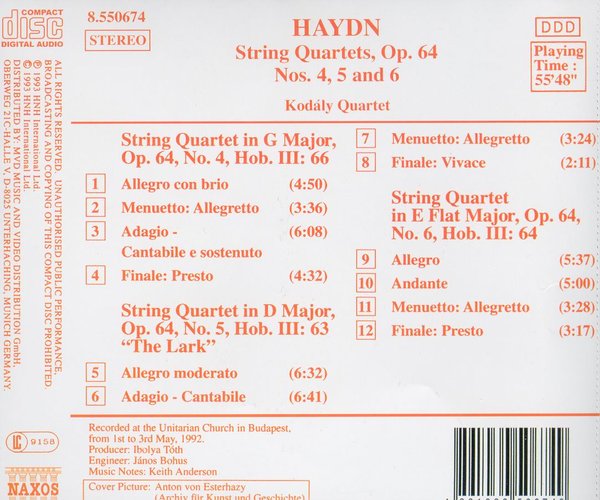 : G大调弦乐四重奏 作品64第四号 HobⅢ:66 String Quartet in G major, Op.64, No.4, HobⅢ:66 01. 第一乐章:灿烂的快板 Allegro con brio 4:50 02. 第二乐章:小步舞曲:稍快板 Menuetto: Allegretto 3:36 03. 第三乐章:慢板 Adagio-Cantabie e sostenuto 6:08 04. 第四乐章:终曲:急板 Finale: Presto 4:32 D大调弦乐四重奏 作品64第五号HobⅢ:63“云雀” String Quartet in D major, Op.64, No.5, HobⅢ:63“The Lark” 05. 第一乐章:中庸的快板 Allegro moderato 6:32 06. 第二乐章:如歌的慢板 Adagio-Cantabile 6:41 07. 第三乐章:小步舞曲:稍快板 Menuetto-Allegretto 3:24 08. 第四乐章:终曲:甚快板 Finale: Vivace 2:21 降E大调弦乐四重奏 作品64第六号HobⅢ:64 String Quartet in E flat major, Op.64, No.6, HobⅢ:64 09. 第一乐章:急板 Allegro 5:37 10. 第二乐章:行板 Andante 5:00 11. 第三乐章:小步舞曲:稍快板 Menuetto: Allegretto 3:28 12. 第四乐章:终曲:急板 Finale: Presto 3:17