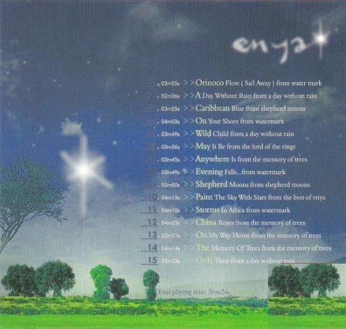 : 01. Orinoco Flow ( Sail Away ) from water mark 航行 ( 水印专辑 ) 02. A Day Without Rain from a day without rain 雨过天晴 ( 雨过天晴专辑 ) 03. Caribbean Blue from shepherd moons 加勒比海之蓝 ( 牧羊人之月专辑 ) 04. On Your Shore from watermark 在你的海岸 ( 水印专辑 ) 05. Wild Child from a day without rain 大地之子 ( 雨过天晴专辑 ) 06. May It Be from the lord of the rings 衷心祈祷 ( 电影:魔戒现身 ) 07. Anywhere Is from the memory of trees 四处皆然 ( 树的回忆专辑 ) 08. Evening Falls…from watermark 夜幕低垂 ( 水印专辑 ) 09. Shepherd Moons from shepherd moons 牧羊人之月 ( 牧羊人之月专辑 ) 10. Paint The Sky With Stars from the best of enya 彩绘星空 ( 恩雅世纪精选专辑 ) 11. Storms In Africa from watermark 非洲的暴风雨 ( 水印专辑 ) 12. China Roses from the memory of trees 中国玫瑰 ( 树的回忆专辑 ) 13. On My Way Home from the memory of trees 归乡的路 ( 树的回忆专辑 ) 14. The Memory Of Trees from the memory of trees 树的回忆 ( 树的回忆专辑 ) 15. Only Time from a day without rain 唯有时光 ( 雨过天晴专辑 )