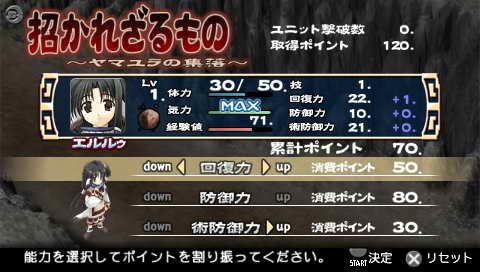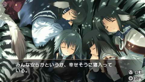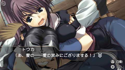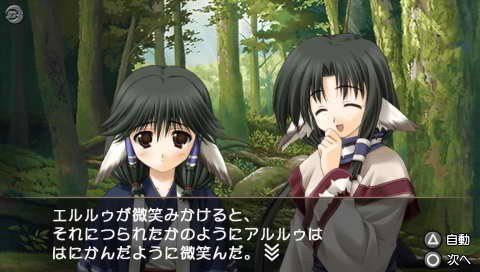 PSP版《传颂之物:携带版》(Utawarerumono Portable)最大特色是拥有丰富的登场人物,光是主线剧情重要的角色就多达十九名以上。而且为这些角色配音的声优阵容也颇为庞大,为此开发商 AQUAPLUS日前还特意为本作召开一个声优记者招待会。在会场上,为本作配音的声优们也纷纷上台做自我介绍和献唱主题曲《UTAWARERUMONO》。这其中有玩家和动漫迷们非常熟悉的:钉宫理惠、中原麻衣、泽城美雪、浪川大辅等等,所以说本作非常值得玩家期待。游戏进行方式为文字对话AVG和S·RPG战略角色扮演两种类型互相交替进行。本次在PS2版的基础上追加战斗难易度设定选项,这样即使是不擅长SLG游戏的玩家也能轻松享受游戏内容。既然移植到了PSP上,游戏画面自然要由原本的4:3改为16:9,不过本作仍保留了4:3的画面显示方式,玩家可以自由选择。不过看下图16:9画面似乎只是简单地将图片截小而已,要享受到完整的CG图片还是要看4:3的。游戏将通过文字冒险与策略角色扮演两部分展开故事。在文字冒险部分玩家可以欣赏到高水准的人设与出色的游戏CG插图;而在战斗部分玩家要使用角色们“技”去与敌人战斗,当技达到一定数值后便可以释放强力的必杀技。