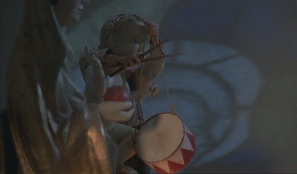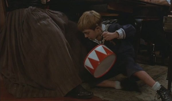 奥斯卡,一个在三岁时主动中断了成长的孩子,太容易让人联想起另一个不愿长大的孩子——虚无岛的彼得潘。他们以一种孩子的优越感与愤世嫉俗拒绝成人社会,拒绝变成那一种人,然而,彼得潘自始至终是个孩子,他的对成人社会的拒绝是出于一个孩子的直觉与本能,奥斯卡却只是保持了三岁孩子的身高,他有着超越成人的成熟灵魂,并且在三十年里在畸形的躯壳里这个灵魂从未中止成长。他与这个社会格格不入,是因为他超越了这个社会,这个畸形躯壳里的灵魂如此清醒,始终用超过成人三倍的智慧注视着这个世界。清醒始终是痛苦的,若不是整个社会错了,那就是你错了。无处可躲无路可逃,只有在游戏中遗忘,只有用游戏拯救。整个世界只是个大游乐场,成人比孩子可笑,孩子比成人残忍。当电影进行到一群孩子将撒了尿的炖癞蛤蟆汤往奥斯卡嘴里灌的时候,你能说,这是个正常美好的世界?自言自语的奥斯卡只有兀自敲着滑稽的鼓点,拯救,或者遗忘。只有这一种方式。