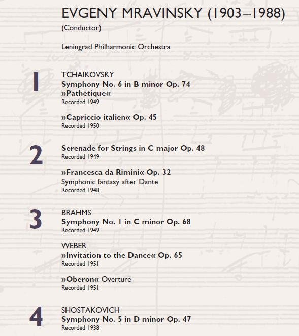 请看曲目表:无论是CD1中的1949年柴6、CD2中的1949年老柴弦乐小夜曲、CD3中的1951年勃1与CD4中的1938年肖5(不久前我已发布),都是不可错过的珍贵历史录音。尽管它们虽然因为岁月的洗礼变得不再清晰,但它的灵动与精准仍然令听过他们之后的人们赞叹不已,这些经过数码remastered的古董级录音仍然显得熠熠生辉。