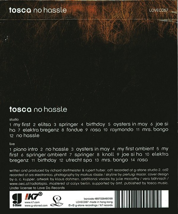 沉静多时的奥地利Downtempo,Trip Hop代表Tosca,在2009年终于携新专辑《No Hassle》与大家见面。以前已经有听Tosca的朋友,不要错过这张!K7厂牌的新鲜出品了!