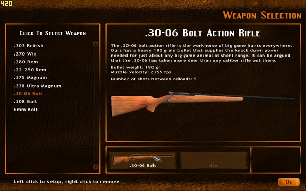 开始武装!从包括32样以上武器的巨大军械库中挑选武器吧。有霰弹枪、来复枪、石弓还有更多等着你!还有各种各样的装备等你购买,包括双筒望远镜、气味跟踪器、来复枪瞄准镜还有更多帮助你诱惑追踪猎物的东西。