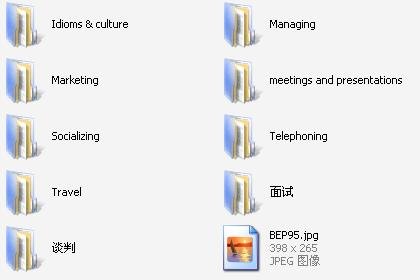 2010年11月22日更新声明:本次更新的内容主要为Interviews, presentations and meetings的Mp3和TXT文件(部分音频有对应PDF文档),部分可能与前面资源有重复,请大家看看以前下载的东西,下载没有的文件即可。 声明一下:标题中所谓的 对应文档 指的不是音频对应的文字,而是听音频前要看的一个简介(有时候音频中会包含介绍文字)以及听完音频后需要回答的问题。 对于大家所说的没有原的问题,这里跟大家说下,由于本人所在的局域网网络有点问题,这几天不太稳定,本人假期基本属于全天侯供源的,大家先收藏,添加下载链接,正常的时候自然就会可以下载了。 简介: 此资源都是商务英语相关的一些真实场景的模拟音频,分类很全,个人感觉很不错。主要包括 Travel, meeting, managing等方面的内容。 这里的音频每一则大概三四分钟左右,音频后半部分为前面对话的详细讲解,一般包含里面出现的一些商务词汇,俚语啊,习语等等,相信大家不用看文档,听不懂的同志可以听听后面的讲解,相信您可以做到。 压缩包截图: