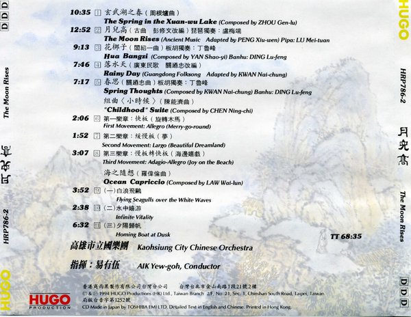 传统古曲、国乐新作,权威录音师、雨果监制易有伍亲自指挥,高雄市立国乐团精心演绎,板胡独奏曲《花梆子》、组曲《小时候》、《海之随想》等首次数码录音。