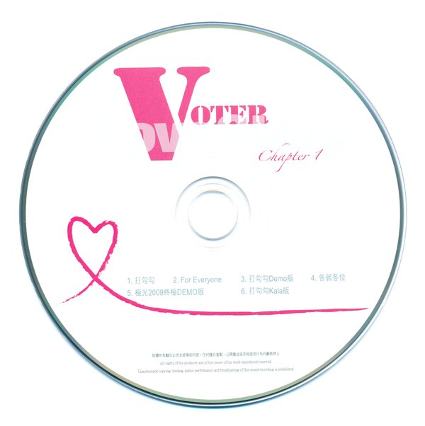 打勾勾 2009最传唱承诺系情歌代表作 你还记得跟谁打过勾勾吗? 你还记得那些纯真承诺吗? 你还记得那些青春曾经在你生命中刻下的喜怒哀乐吗? 承诺是简单的.而实现承诺却是一件不容易的事! 我想写一首甜蜜的情歌 用乾净的童音.唤醒你心中那一块纯真~~ 各就各位 首度嚐试温暖系舞曲 这首是为了极光舞团.首次突破歌舞演出而创作的歌曲 这次除了音乐上的合作.最重要的是要载歌载舞 在学舞过程中.必须从零开始. 所以我用突破自己的观点.就好像赛跑一样 站在起跑点.要竞争的对手不是别人而是自己! 相信你们会看到和听到Voter在这首歌上的蜕变 极光2009终极DEMO版 2005年Voter诞生 一个坚持爱唱歌.努力追求梦想的音乐人 因为这首歌而圆梦.拥有自己的单曲 歌迷高询问度及期待.让Voter生命中的极光 4年后再度重现 打勾勾吉他 DEMO 版 这首歌是整张EP的发想 所以决定收录最真实的自己和给你们的心里话 谢谢所有一路以来一直支持着我的你们 和许多为这张EP奉献心力的朋友 谢谢你们~~