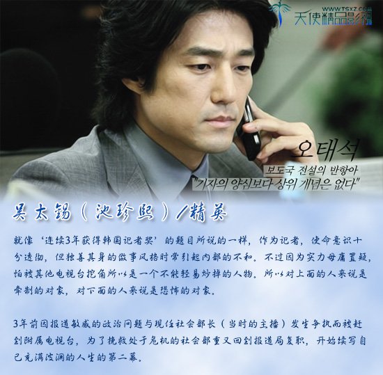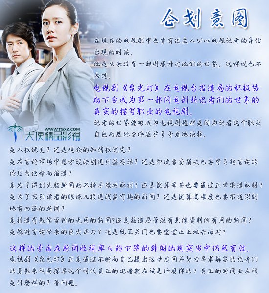 】故事剧情显示出在电视广播任职的女性热烈工作身姿还有环绕着她的故事。'聚光灯'是在述说围绕在新闻报导的电视台记者们的热情和采访过程等中的纠葛,将他们的生活写实的呈现出,将电视新闻台里的多样面貌紧张的描绘出的专门性电视剧. 【制作出品】凤凰天使TSKS韩剧社(www.tskscn.com)