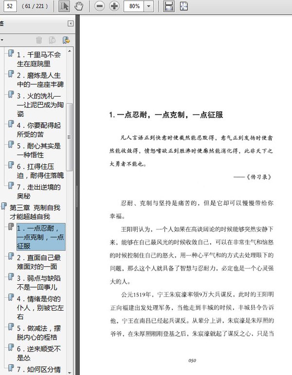 : 第一章要做事儿,先修心1.新唯“心”主义:一切皆由心生2.不会自我调节,注定被3.卓绝的头脑比不过强大的内心4.心灵自然纯粹,才能创造奇迹5.表面迎合不如内在契合6.世风起,心灯不灭第二章每一次磨炼都能让你更强大1.千里马不会生在庭院里2.磨炼是人生中的一座座丰碑3.火的洗礼——让泥巴成为陶瓷4.你要配得起所受的苦5.耐心其实是一种悟性6.扛得住压迫,耐得住落魄7.走出逆境的奥秘第三章克制自我才能超越自我1.一点忍耐,一点克制,一点征服2.直面自己最难面对的一面3.弱点与缺陷不是一回事儿4.情绪是你的仆人,别被它左右5.做减法,摆脱内心的桎梏6.逆来顺受不是怂7.如何区分情感与私欲第四章志一立,天下无难事1.回归婴儿,找到生命的方向2.立志后,万事就是一事3.重要的不是做什么,而是为什么4.目标就像人生大船上的舵5.“正确”的志PK“错误”的志6.没担当,立志就是放空炮7.凭什么可以坚持不懈第五章用行动来改变观念1.不去做,看再多书也没用2.全身心体验,与事融为一体3.在行动中修正自己的想法4.负面情绪也可以化为积极行动5.做自己认为有价值的事情6.改变自己没有你想象中难7.了解未来,学会变通第六章坚持自己,更要能包容别人1.你是天,你是地,你能坚持,也能包容2.大事坚持大是,小事不念小非3.有所不为,才能真正有为4.该退让就退让,没必要寸步不让5.今天抱怨,将来一辈子都会抱怨6.为什么有的人能够从容自在第七章态度不能决定一切,但能决定结果1.把自己看成圣人,你就是圣人2.别找了,你就是自己的贵人3.找准角度才能端正态度4.傲慢最终只能慢怠自己5.真正的领导不发威6.决断,然后去行动7.如何养成强大的气场第八章提升境界,就能看到光明1.名和利会让人失去自我2.你的档次决定你的层次3.恢复心的本性4.尽职尽责是自己的事儿,与他人无关5.安定的心灵土壤里滋生出慧根6.心无所求才能有求必应7.唤醒你内心的良知