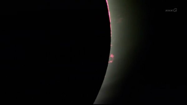 前两点因天气问题看不到,但后两个观测点十分好天。NHK拍摄出来的效果十分稳定与细腻(细至日珥都拍到,钻石环出现前后拿开减光片出来的拍摄效果也相当不错)。虽然海上邮轮时对焦不稳与摇晃,但也是很精采的一次拍摄。