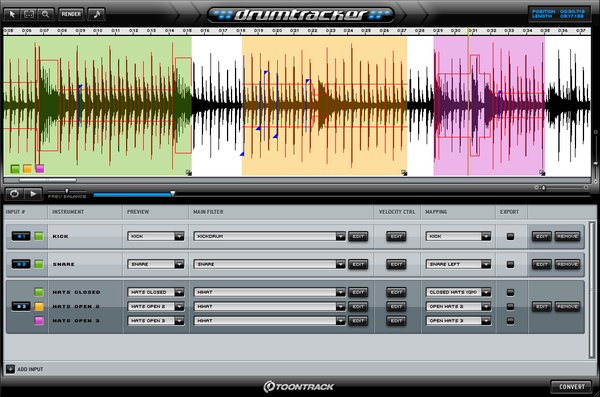Toontrack Drumtracker drum replacement software allows you to replace the drum sounds you want, the way you want. One of the great aspects of Drumtracker is its intuitive layout, which lets you work easily. This standalone multitrack software gives you an array of MIDI output options. You get manual control over export and tracking functions, and you easily choose which parts of a drum track you'd like to export, right down to individual hits. If you're looking for a flexible tool for drum replacement, check out the Toontrack Drumtracker.